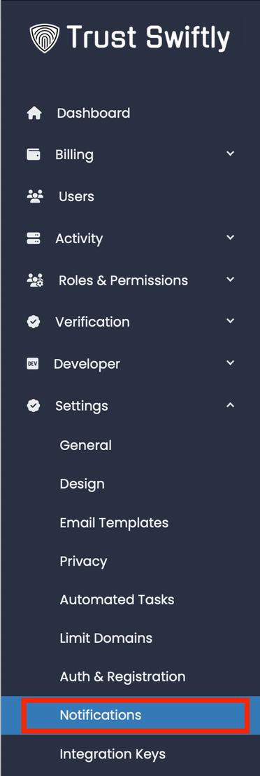 Step 1: Open the notifications page. From the side menu, click on the ‘Notifications’ menu entry.