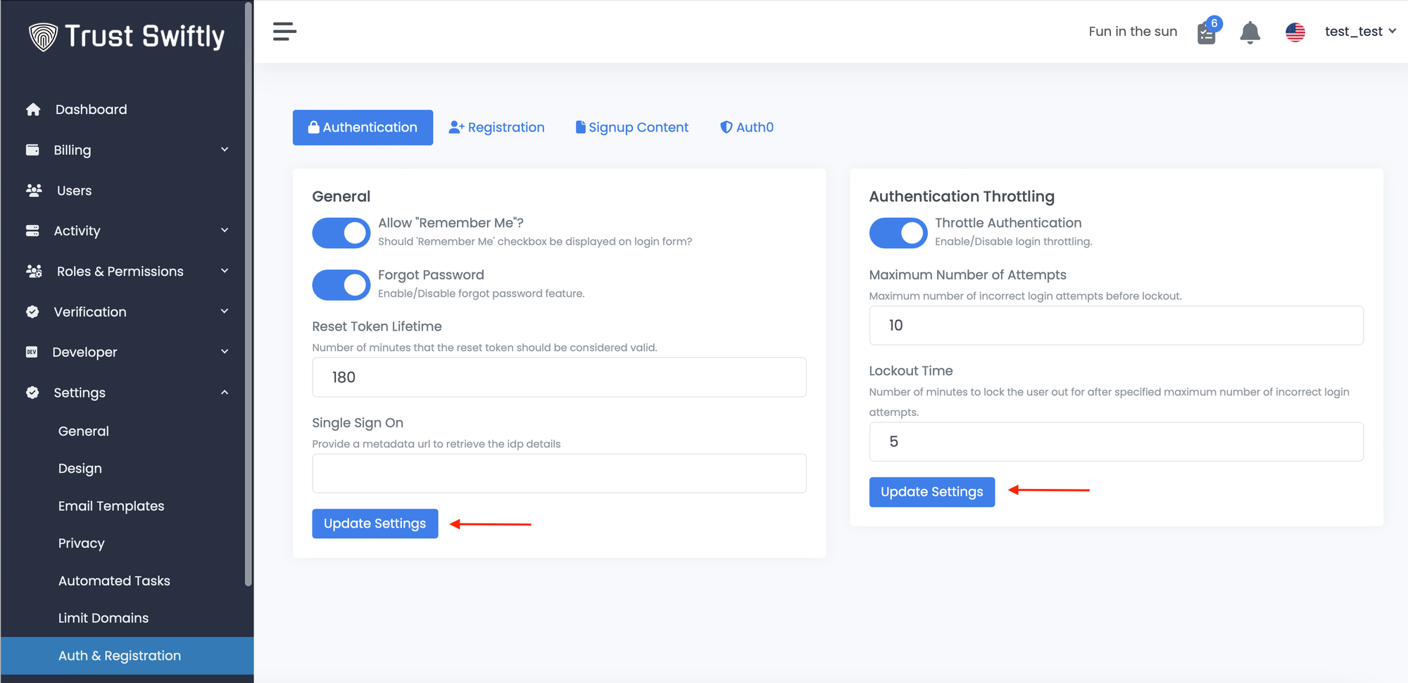 On the top right, you can control authentication attempts and the time that the user will be locked should include the number of attempts pass. Once completed updating, click on the ‘Update Settings’ button.