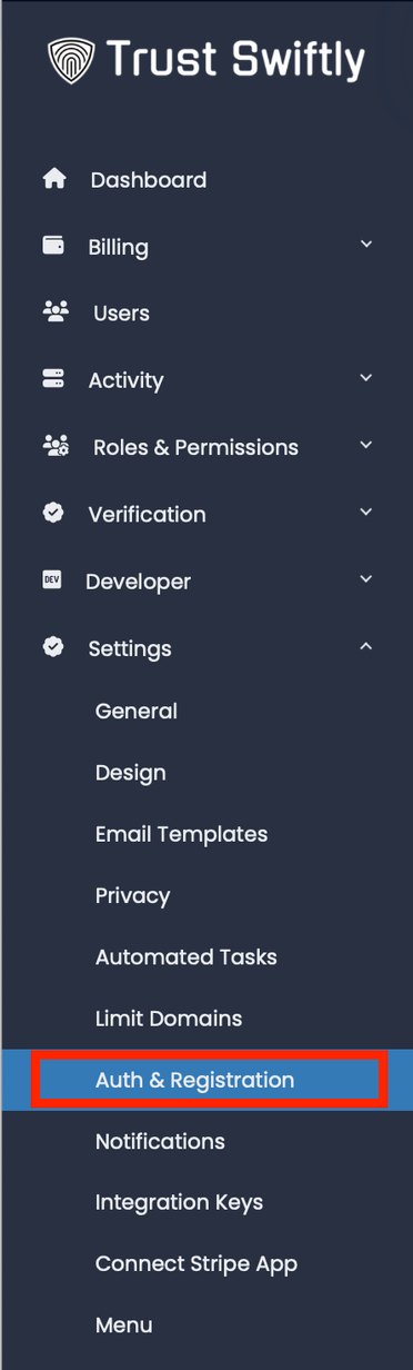Step 1: Open the Auth & Registration page. From the side menu, click on the ‘Roles’ menu entry.