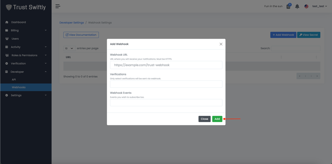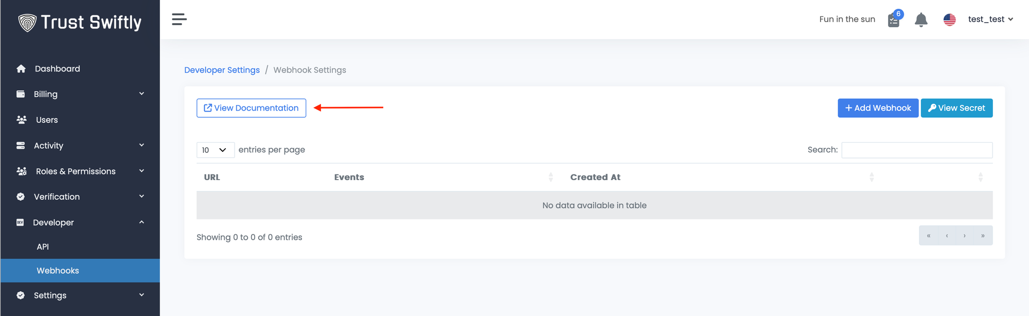 Note: If you need to learn more on the webhooks, click on the ‘View Documentation’ button, or navigate to the following URL - https://www.trustswiftly.com/account/settings/webhooks/documentation