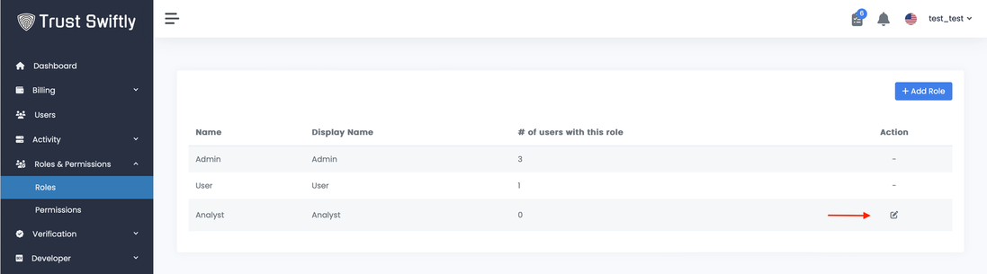 . The Roles screen will be opened. Click on the pencil icon on the role you want to edit.