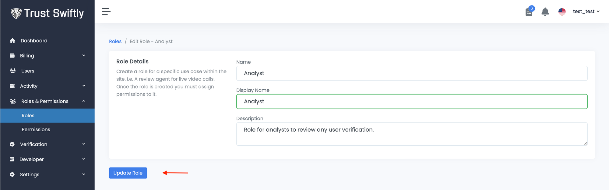 Step 3: Make the changes. The role details screen will be opened. Make the required changes and click on the update button. If everything went well, you would be redirected to the roles page seeing a confirmation message that the role was updated successfully.