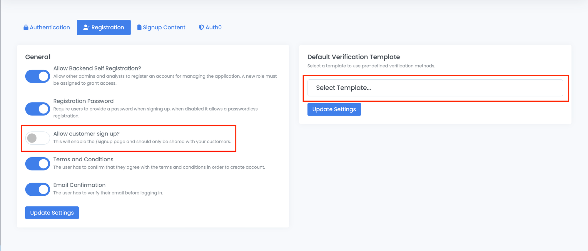 Step 2: Enable signups. Allow users to signup and select the default verification template. https://NAME.trustswiftly.com/settings/auth