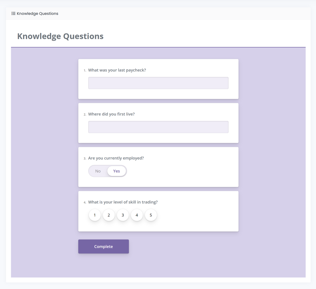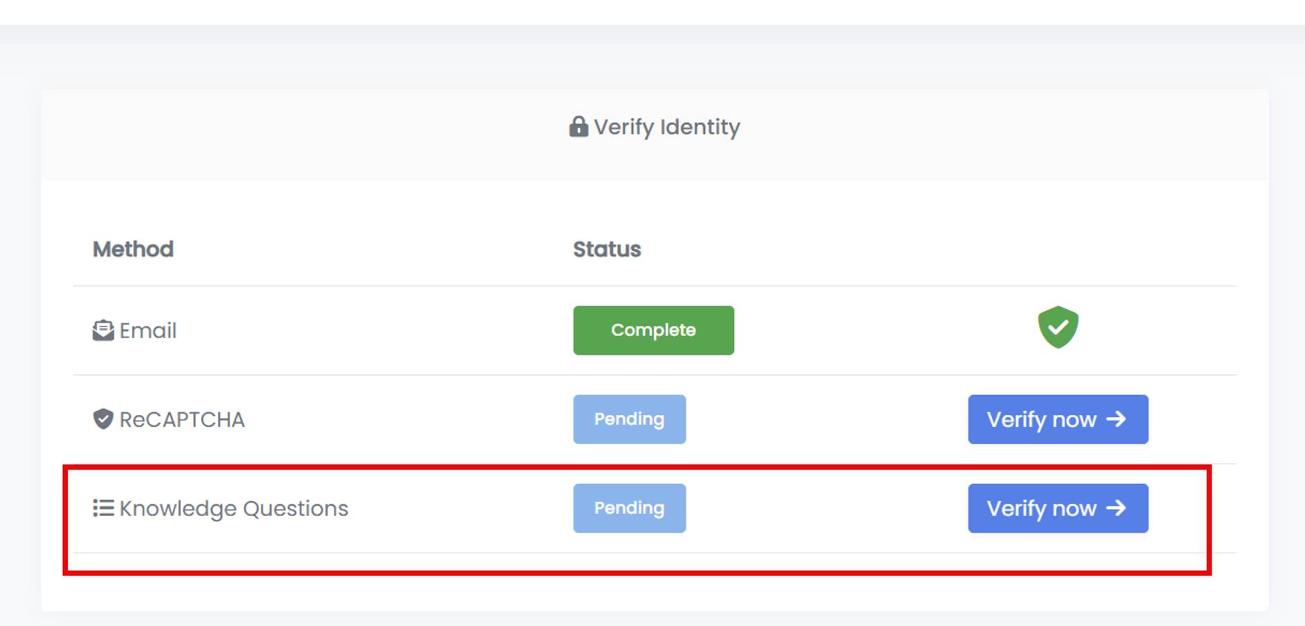 Step 1: Click on the ‘Verify’ button at the Knowledge row. Depending on the custom options set the name may differ. Knowledge questions are used for onboarding or other information collection forms.