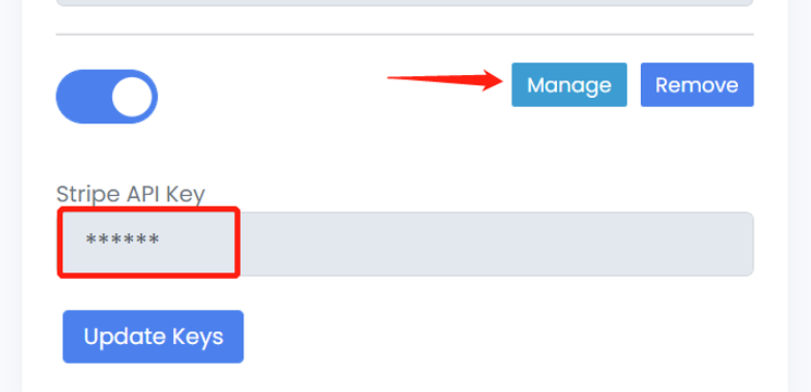 2. Paste the Stripe API Secret Key in your Trust Swiftly management page then Update keys and then Manage.