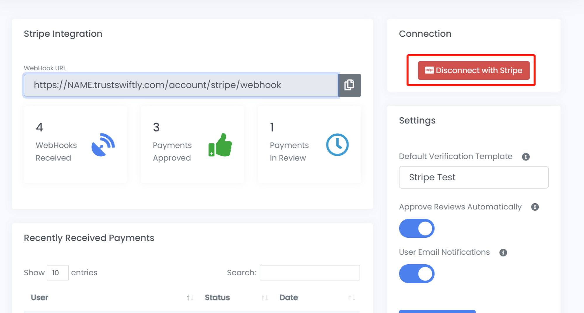 5. In the Connection section click Connect with Stripe and login. Review your verification settings for Stripe at https://NAME.trustswiftly.com/settings/stripe